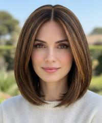 Startseite /Perücken/Perücken aus Synthetikhaar/Alltagsperücken/ Elegante mittelbraune Kunsthaarperücke mit goldenen Strähnen (Lace Front & Mono Top) DMT005