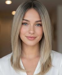 Startseite /Perücken/Perücken aus Synthetikhaar/Alltagsperücken/ Elegante glatte Kunsthaarperücke – Schwarzer Ansatz mit blondem Haar (Lace Front) DLP007