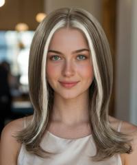 Startseite /Perücken/Perücken aus Synthetikhaar/Alltagsperücken/ Kunsthaarperücke – Leinenbraun mit platinblonden Highlights vorne (Lace Front) DLP032