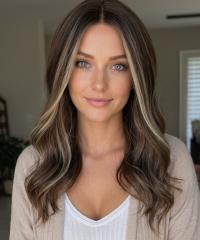 Startseite /Perücken/Perücken aus Synthetikhaar/Alltagsperücken/ Dunkelbraune gewellte Kunsthaarperücke – mit zwei goldenen Strähnen (Lace Front) DLP039