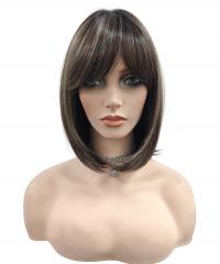 Startseite /Perücken/Synthetische Perücken/Alltagsperücken/ Synthetische Perücke in Kastanienbraun mit blonden Highlights und Pony (Lace Part) DLP050