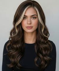 Startseite /Perücken/Perücken aus Synthetikhaar/Alltagsperücken/ Gewellte Kunsthaarperücke mit Seitenscheitel – Rotbraun mit blonden Strähnen vorne (Lace Front) DLP059