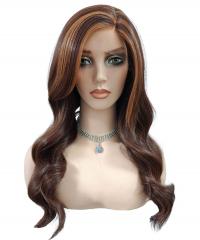 Startseite /Perücken/Perücken aus Synthetikhaar/Alltagsperücken/ Linker Scheitel Kunsthaarperücke in Tiefbraun mit Goldblonden Strähnen und Locken (Lace Front) DLP064